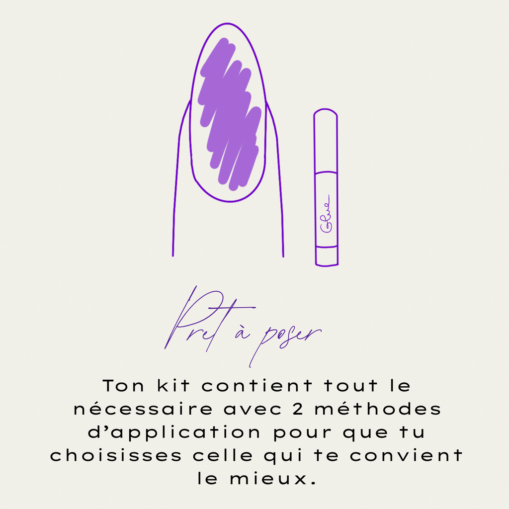 Chaque set est livré avec un kit complet d’application (colle, bâtonnet, lime, buffet, lingette).